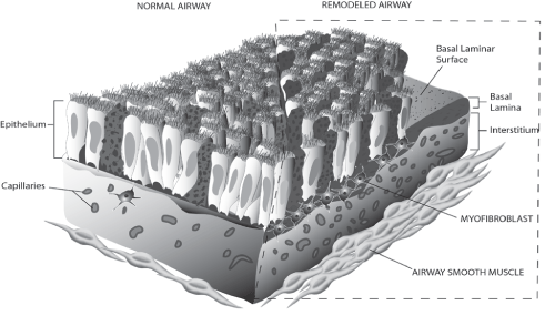 | Figure 1: Airway Remodeling. The schematic above is split figure with normal airway represented on the left and a remodeled asthmatic airway on the right. The key features of the remodeled airway include mucous cell hyperplasia, thickening of the basement membrane with associated proliferation of myofibroblast, increased vascular density and increased smooth muscle hypertrophy. Together these changes predispose to airway hyper-responsiveness. |