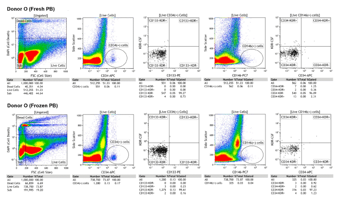 analyzed fresh and after cryopreservation. A. PBMC was assessed as viable by negative staining for DAPI. B. CD45+ cells were excluded and the rest of the cell population was further gated for CD34+ cells. C. CD34+ cells were gated for CD133 and VEGFR2 for enumeration of double and triple positive subsets of EPC. D. CD 45+ cells were excluded and live cells were further gated for CD146+. E. CD 146+ cells were further gated for CD34 and VEGFR2/ (KDR) for enumeration of double and triple positive subsets of EC. |