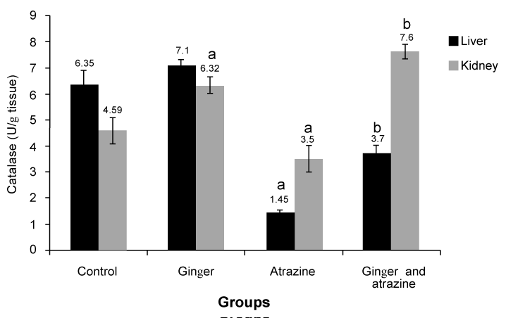 | Figure 6: Effect of atrazine and ginger on the CAT activities in liver and kidney. CAT activity was determined by measuring the decrease in absorbance (H2O2 degradation) at 240 nm. In the assay 10 µl of liver homogenate was used (see Section 2.9) and activity was expressed as µmol of H2O2 consumed min/g/ tissue. Values are expressed as mean ± SE (n=5). aSignificantely different from control P < 0.05. bSignificantly different from atrazine group P < 0.05. |