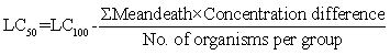 The LC50 value of the seed extract of Annona squamosa for 48 h has been determined according to the arithmetic method of Karber (1931). The calculation was done as following:   LC50 = 500 – 155 LC50 = 345ppm | ||||||||||||||||||