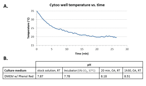 | Figure 6: Evaluation of the temperature and pH variation rate during cell detachment. A. Cooling of the CytooTM well was assessed with a thermal infrared camera (FLIR A20). After a 1-h incubation at 37°C, the Cytoo well was left to cool at room temperature. B. pH measurements of the culture media after exposure to open air at different time points. OA: open air, RT: room temperature. For comparison, the pH values of the incubated media and of the stock solution are provided. N=3. |
