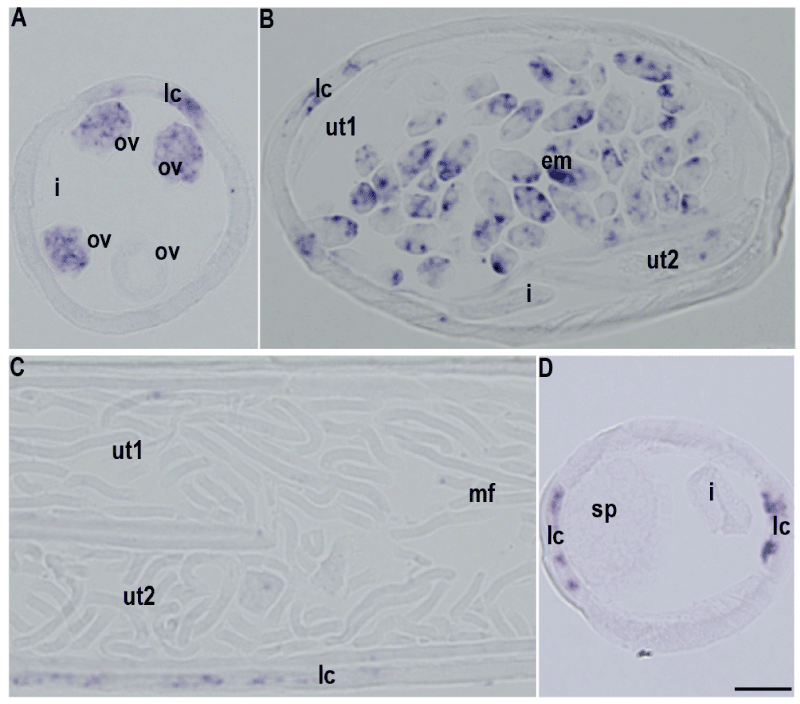 | Figure 4: ISH results for expression of Wolbachia surface protein gene (wsp) in adult Brugia malayi worms. ISH signals were detected in both adult female (A-C) and adult male (D) worms. (A) wsp expression in lateral cord and some but not all developing oocytes in ovaries; (B) wsp expression in lateral cord and early stage embryos (morula stage); (C) lateral cords are labeled, but late stage embryos (stretched microfilariae) are not labeled; (D) only lateral cords are labeled in adult males. Abbreviations: i: intestine; lc: lateral cord; ov: ovary; ut: uterus; mf: stretched microfilariae; sp: developing sperm; em: embryo; scale bar: 20 μm. |