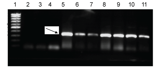 | Figure 4: Electrophoresis of amplification products from genomic DNA of infected mice urine at different time points post infection. At 3rd, 9th, 12th, 15th, 18th, 21st and 30th (5, 6, 7, 8, 9, 10 & 11espectively) were subjected for electrophoresis on 1.5% agarose gel containing ethidium bromide parallel to 100 bp DNA ladder (lane 1), products from a negative control of PCR reaction (lane 2) and control of non infected urine (3 & 4) PCR reaction where 338 bp specific amplification products were visualized at all time points that were not evidenced in the both control and negative control lanes. |