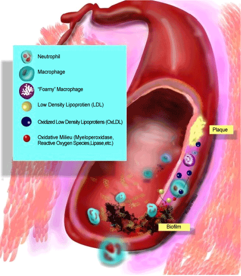 | Figure 2: Model of biofilm’s possible role in the pathogenesis of atherosclerosis. This illustration outlines one possible pathway by which bacteria may participate in the pathogenesis of the formation of atherosclerotic plaques. It is possible that not only white blood cells but also bacteria can attach to the areas of endothelial cells within the arteries that have upregulated ICAMs and VCAMs due to hydrodynamic injuries. Once bacteria have attached to these sticky areas, they are committed to biofilm phenotype mode of growth. Biofilm phenotype bacteria quickly produce senescence of the host cells to which they are attached, produce a protective extracellular matrix, and downregulate virulence factors. This leads to a tightly bound polymicrobial community of bacteria producing intense inflammation through the inducement of proinflammatory cytokines such as interleukin 1, interleukin 8, interleukin 6, gamma interferon and tumor necrosing factor alpha. The proinflammatory cytokines produce an oxidative milieu through the production of nonphysiologic levels of myeloperoxidase, reactive oxygen species, lipases, and many other oxidative products. It has been generally agreed that this type of oxidative milieu is sufficient to produce oxidative low density lipoproteins (OxLDL) which, in turn, produce macrophages capable of ingesting these degradated LDLs. Foamy macrophages then deposit in the area incasing the biofilm thus sequestering the biofilm in such a way as to allow some repair. Because of the persistent, intense inflammation produced by the biofilm, the “healing” over the plaque is often fibrotic. Although there is much speculation in this scenario, a biofilm role in the pathogenesis of atherosclerosis sheds light on many of the unanswered questions of atherosclerosis. |