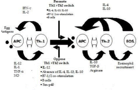 | Figure 2: The immune response during infection with S. mansoni . The early response to egg antigens is of the Th-1 type, characterized by the indicated signature T cell and APC-derived cytokines; this response switches to a Th-2 type, also marked by typical cytokines. The upper box lists factors that facilitate the Th-1 to Th-2 switch. In contrast, conditions listed in the lower box oppose the Th-1 to Th-2 switch. [Modified from 20]. |