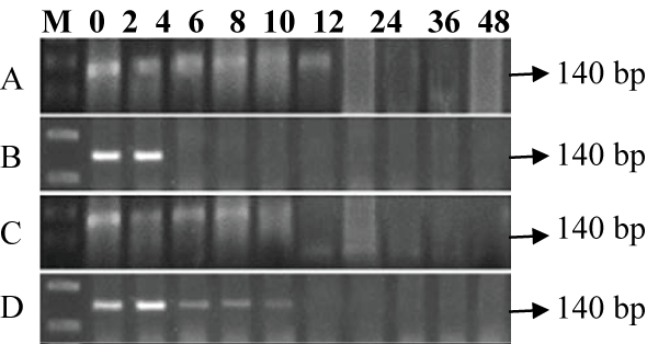 | Figure 4: RT-PCR time course analysis of Hsp 90 (140 bp) expression in different tissues of white shrimp Litopenaeus vannamei at 0,2,4,6,8,10,12,24,36 and 48 h post injection of WSSV. Lane M- marker; Land 2 to 12 as 0,2,4,6,8,10,12,24,36 and 48 h. A. Hsp 90 expression in gill tissue B. Hsp 90 expression in muscle tissue C. Hsp 90 expression in hepatopancrease D. Hsp 90 expression in pleopod. |