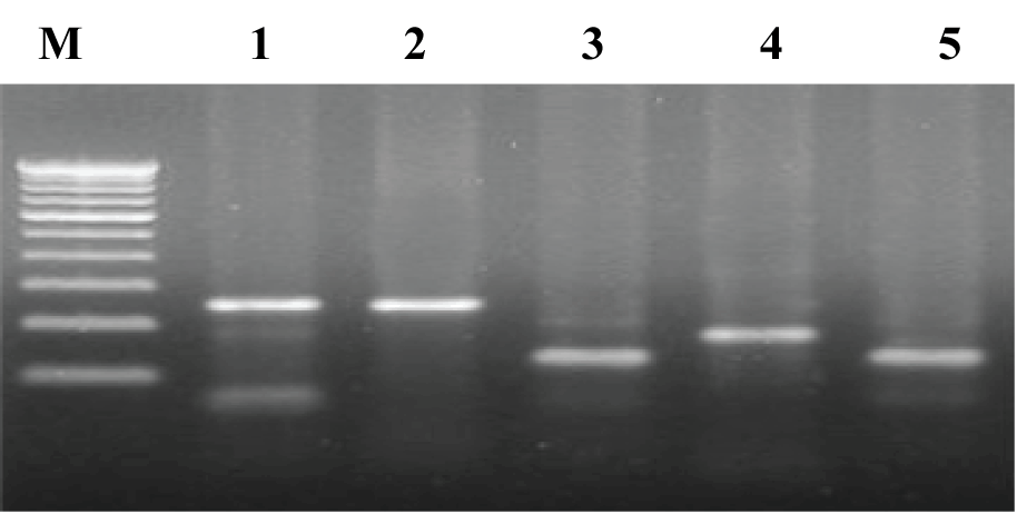 | Figure 9: RT-PCR analysis of immune genes ( Lectin -245 bp, Hemocyanin -242 bp , PoPO -121 bp, BGBP -166 bp, Toll receptor -150 bp) expression in white shrimp Litopenaeus vannamei at 48 h post injection of WSSV+immuzone. Lane M- 100 bp marker; Land 1- Lectin (245 bp), 2- hemocyanin (242 bp) , 3 - PoPO (121 bp), 4 - BGBP (166 bp), 5 - Toll receptor (150 bp). |
