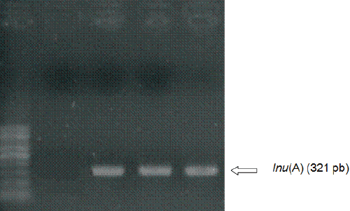 | Figure 1: PCR detection. Lane 1: Molecular weight marker (MWM); Lane 2: Negative control (Sau ATCC 25923); Lane 3: Positive control (Sau lnuA positivo) ; Lane 4: lnuA positive methicillinsusceptible Sau; Lane 5: lnuA positive methicillin-resistant Sau. |