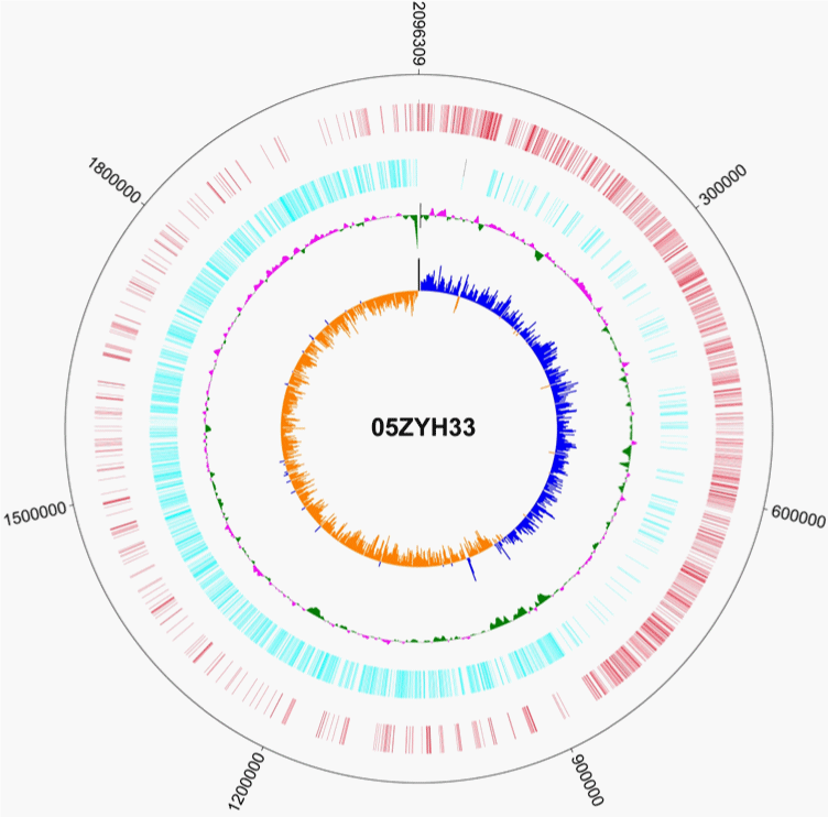 | Figure 1: Circular representation of the reference genome 05ZYH33. The outer circle shows the genome scale. The second and third circles display predicted coding regions on the plus and minus strands, respectively. The fourth circle shows the GC content, Values >41.1% (average) are plotted outward (pink) and values < 41.1% are inward (green). The inner circle shows the GC skew, Blue indicates values>0, and orange indicates values<0. |