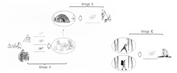 | Figure 1: The enclosed graph depicts the biological and filogenetical evolutions of P. vivax, P. malariae, and P. ovale (Group A), compared with the extremely more recent evolution pathway of P. falciparum (group B). P. knowlesi (belonging to group C), is the last Plasmodium species which steadily entered the human pathology, and is related to productive and touristic human activities carried out in the forest regions of Malaysia and Borneo. The image has been taken and modified from some studies published by L. Capasso (quoted at reference [1]), in particular with the adjunct of group C malaria parasite. |