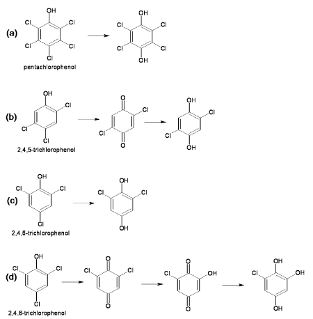 | Figure 2: Dehalogenations of polychlorinated nitroaromatic compounds by monooxygenases. (a) Dehalogenation of pentachlorophenol by pentachlorophenol 4-monooxygenase; (b) dehalogenation of 2,4,5-trichlorophenol by chlorophenol 4-monooxygenase; (c) dehalogenation of 2, 4, 6-trichlorophenol by 2, 4, 6-trichlorophenol monooxygenase (d) sequential dehalogenation of 2, 4, 6-trichlorophenol by 2, 4, 6-trichlorophenol monooxygenase |