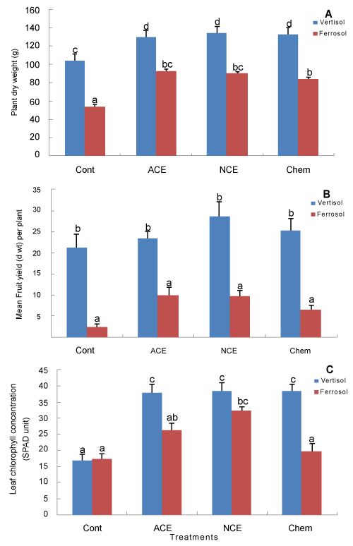 | Figure 4: Data from Experiment 2 on (A) total above-ground biomass (g d wt per plant) of tomato subject to four treatments after four months of planting on two soil types, (B) fruit yield of tomato (g d wt per plant), (C) leaf chlorophyll concentration (SPAD unit) measured at 76 days after transplanting of tomato. (i) Cont: Non-fertilised, (ii) ACE: Aerated compost extract, (iii) NCE: Non-aerated compost extract (iv) Chem: Chemical fertilizer. Within a given soil type, means with different letters indicate significant difference (P < 0.05) and vertical bars represent the standard error of the mean (n = 6). |
