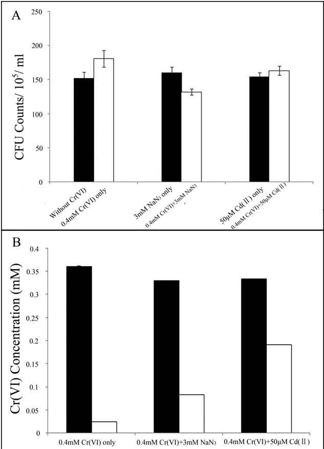 | Figure 4: Effects of inhibitors of Cr(VI) reduction on strain LZ-01. (A) Effects of NaN3 and Cd(II) on LZ-01 growth (CFU) in M9 medium without (■) and with (□) Cr(VI). (B) Cr(VI) concentration before (■) and after (□) incubation in M9 medium with Cr(VI) only, Cr(VI)+NaN3 and Cr(VI)+Cd(II). |