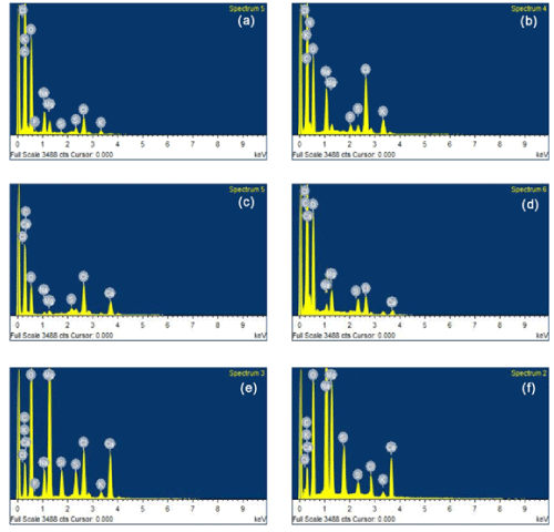 | Figure 4: EDS spectra of the biomass of (a) P. valderianum BDU20041 and (b) O. willei BDU130791 grown in ASN III medium and in ossein effluent (c and d). Precipitates obtained by the growth of P. valderianum BDU20041 (e) and O. willei BDU130791 (f) in ossein effluent. |