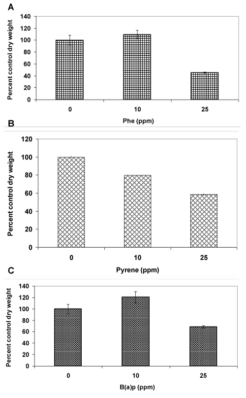 | Figure 2: PAH tolerance in Phanerochaete chrysosporium; 2A. Phenanthrene; 2B.Pyrene; 2C.Benzo(a)pyrene. Fungal cultures were grown at 37°C in an environmental shaker (180 rpm) for 72 hours. Test PAH compound was added at the 24 hour time-point using one of the following test concentrations: 0, 10, and 25 ppm PAH. Biomass were harvested by vacuum filtration and dried to a constant weight at 80°C. Values plotted represent average of triplicates ± standard deviation. |