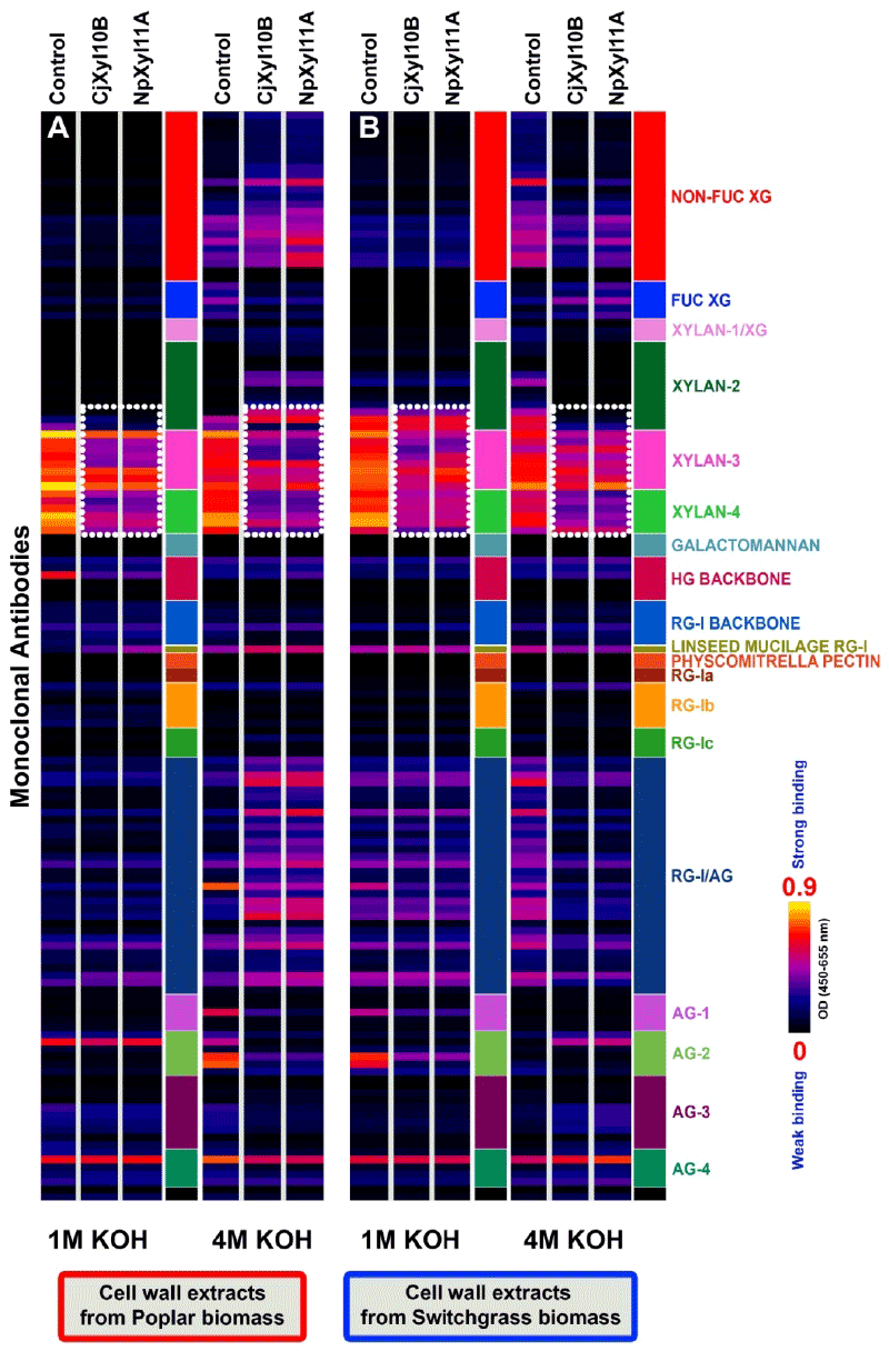 | Figure 3: ELISA screening using cell wall glycan directed McAbs of various cell wall extracts generated from pre-delignified poplar (A) and switchgrass (B)