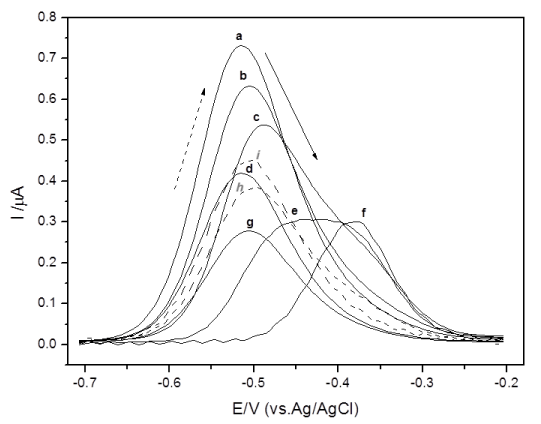 | Figure 6: Effect of increasing concentrations of diamide (13.25-63.2 μmol/L) on the SW voltammograms (δ current) of reduced glutathione (120 μmol/L) dissolved in 0.1 mol/L phosphate buffer (pH 7.5). Voltammograms that decreases as a function of the concentration of diamide are described with solid line and those that increase in dashed line. Each voltammogram represents the mean of five independent experiments. Other experimental conditions were the same as those described in figure 1. |