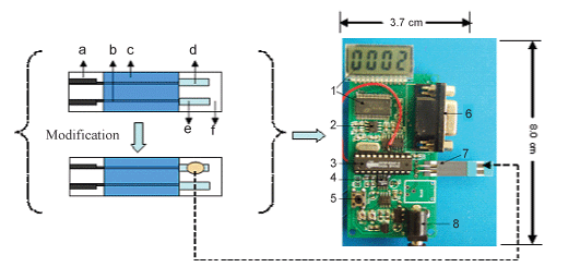 | Figure 1: Schematic diagram of the SPE and components of the hardware of the amperometric sensor. The schematic structure of SPE consisted of following parts: (a) terminal post, (b) electric conductive rail, (c) insulation layer, (d) working electrode, (e) counter electrode and (f) polyvinyl chloride board. The hardware components of the amperometric sensor: (1) liquid crystal display and HT1621 driving chip, (2) MCP3201 A/D converter, (3) EM78P458 single-chip microcomputer, (4) operational amplifier, (5) function key, (6) data-interface, (7) SPE slot and (8) battery (output, 6 V). |