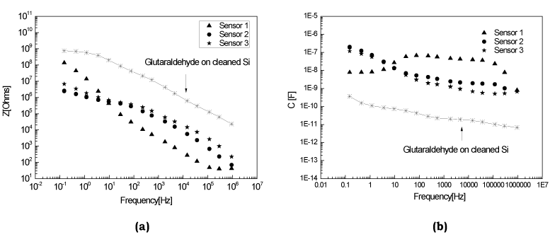 | Figure 5: Comparative study of Sensors using 3-terminal characterization. ▲: Sensor 1: Silicon based substrate with 2 hours of pG-AuNPs incubation period, ●: Sensor 2: Silicon substrate with 4 hours of pG-AuNPs incubation period. ✶: Sensor 3: Silicon/Silicon Dioxide substrate with 4 hours of pGAuNPs incubation period. Result on Glutaraldehyde surface on cleaned Si substrate is also shown for comparison. (a): Impedance Z versus frequency f, (b) Capacitance C versus frequency f. |