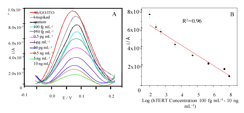 | Figure 6: DPV response studies of Ab/GO/ITO immunoelectrode in 0.05 mM K3Fe(CN)6 contained in 5 mM PBS, pH 7.4 at pulse amplitude 0.03 V and pulse width 0.05 s for various hTERT concentration (100 fg mL-1-10 ng mL-1) spiked in sputum ; (B) Calibration of the immunosensor for hTERT determination in spiked sputum. |