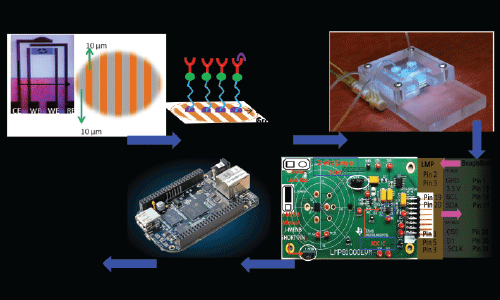 | Figure 1: Schematic illustration of electrochemical immunosensor integrated with microfluidic manifold. This sensing platform is interfaced with miniaturized potentiostat chip (reconfigured LMP 91000 board connected with BeagleBone microcontroller) connected with a microcontroller to detect cortisol using cyclic voltammetry techniques. |