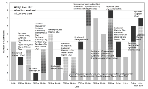 | Figure 1: Number of aberrations in the Ambulance Transfer Syndromic Surveillance Number of aberrations in the Ambulance Transfer Syndromic Surveillance during the enhanced surveillance period at the Fourth Japan–China–South Korea trilateral summit in May 2011. Syndrome I presented in this figure indicates Bloody emesis/Nasal hemorrhage. |