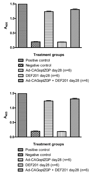 | Figure 5: Humoral immune responses in vaccinated mice with or without DEF201 treatment. A) Serum ZEBOV GP-specific IgG ELISAs. The harvested serum samples were also tested for the presence of IgG antibodies against ZEBOV GP at a 1:50 dilution ratio. The data is reported as the optical density measured by absorbance at 405nm. B) Serum ZEBOV GP-specific neutralizing antibody response. Groups of 3 to 6 mice were vaccinated and treated with or without DEF201, where serum was harvested 28 days post-vaccination. Serum neutralizing antibody levels were reported as the reciprocal of the dilution where greater than 50% viral neutralization was observed. |