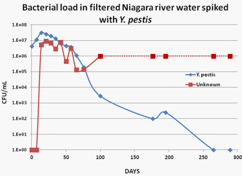 | Figure 2: Outgrowth of a second, non-Yersinia pestis species from Niagara River water following inoculation with Y. pestis reported in CFU/mL as a function of time (days). The concentration of Y. pestis (♦) and unknown (■) were monitored by colony enumeration from TSA II plates. The dotted line depicts where the number of CFUs/mL were too numerous to count. The standard deviation falls below 50% of the plotted value for all calculated points. |