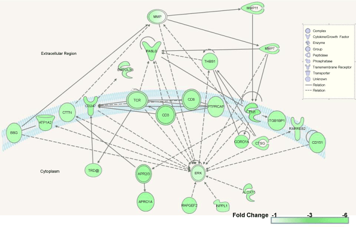 | Figure 5: Regulatory network for matrix metallopeptidases, T-cell receptors, and their downstream signal transducers. The nodes and networks are distributed between the extra- and intercellular regions and the interfaces (not drawn to scale). Green-colored genes are significantly suppressed at all time points after the B. anthracis spore exposure compared to the control cells (a color scale is at the bottom right corner). The nodes represent the genes or proteins (see the legend for detail); and the solid and dashed arrow-headed lines depict the direct and indirect interactions, respectively. |