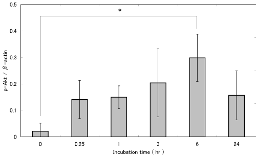 | Figure 9: Time courses of Akt phosphorylation of cells cultured on dishes coated with SELP. The coating concentration is 10 μg/ml. The activity percentage is 100 % for cells cultured on the PVA-coated dishes. Primary culture was performed 5 times independently. *, p<0.05; significant between the two groups. |