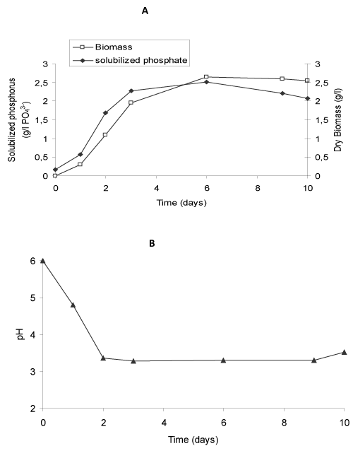 DCP. A: Evolution of released orthophosphates concentration and fungal dry biomass, B: Evolution of pH |