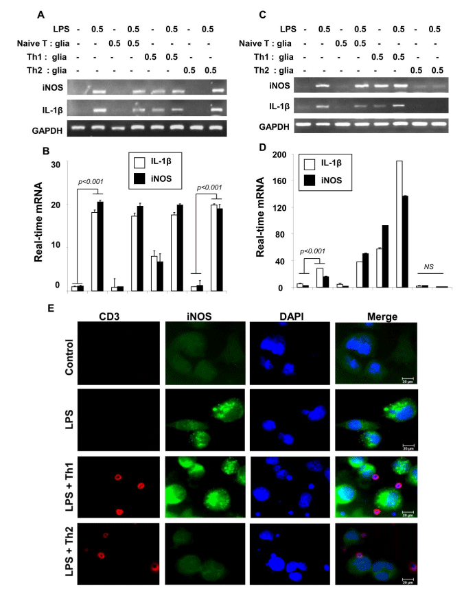 | Figure 4: MBP-primed Th2 cells inhibit the LPS-stimulated expression of IL-1β and iNOS in mouse primary microglia via cell-to-cell contact. Microglia received different concentrations of Th2 cells within insert. After 1 hr, inserts are removed followed by the stimulation of microglial cells with LPS (0.5 μg/ ml) for 1 hr in serum-free condition. After another 5 h of incubation, the mRNA expression of iNOS and IL-1β was analyzed by RT-PCR (A) and by real-time PCR (B). Next, Microglia were stimulated by plasma membranes (equivalent to 0.5:1 of T cell: glia) of normal T cells, MBP-primed Th1 and MBP-primed Th2 cells separately. After 1 hr, microglial cells were stimulated with LPS (0.5μg/ml) LPS. After another 5 h, microglial cells were analyzed for the expression of iNOS and IL-1β mRNAs by semi-quantitative RT-PCR (C) and quantitative real-time PCR (D). (E) Immunocytochemical analyses showed the interaction between CD3-immunostained T cells (red) and iNOS (green) positive LPS-treated microglia. Data are the mean ± S.D. of three different experiments. NS=not significant. |