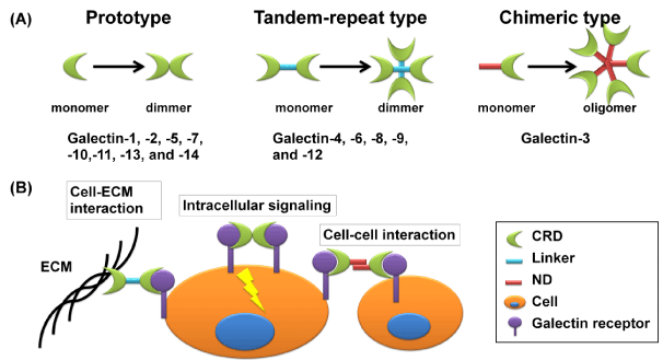 | Figure 1: The structure and function of the galectin family members. (A) The galectin family members are divided into three types: the prototype with one carbohydrate recognition domain (CRD), the tandem-repeat type with two CRDs connected by a non-conserved linker, and the chimeric type with one CRD and a non-lectin N-terminal domain (ND). Some galectins can self-associate into dimers or oligomers. (B) Biological functions of extracellular galectins. Bivalent or multivalent galectins crosslink their receptors on the same cell for intracellular signal transduction, two different cells for cell-cell interaction, or cell and extracellular matrix (ECM) for cell-ECM interaction. |
