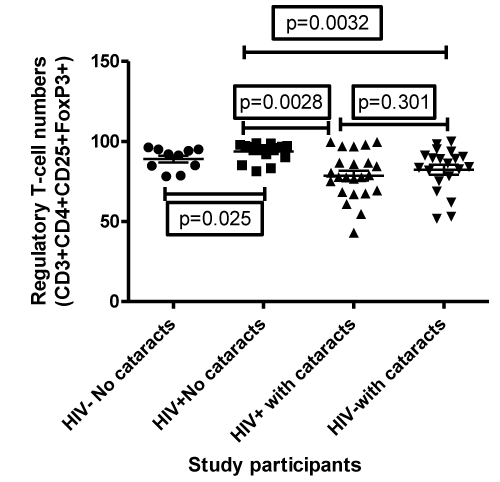 | Figure 2b: Regulatory T-cells among individuals with cataracts and their age-matched HIV-negative counterparts without cataracts. This Figure shows regulatory T-cell numbers (CD3+CD4+CD25Bright+FoxP3+) among 10 HIVnegative without cataracts, 16 HIV-positive without cataracts, 23 HIV-positive with cataracts and 21 HIV-negative with cataracts respectively. |