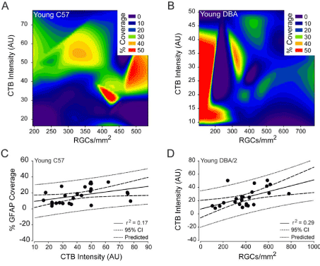 | Figure 12: Percent coverage of retinal area by astrocytes is not a strong predictor of RGC health in young C57 or young DBA/2 retina. (A and B) Contour plot depicting the spatial relationships between percent coverage of retinal area by astrocytes (color bar; % coverage), CTB+ RGC density (x-axis; CTB+ RGCs/mm2) and total CTB intensity (y-axis; arbitrary units) in young C57 (A) and young DBA/2 (B) retina. (C) Regression graph of the positive correlation between total CTB intensity and percent coverage of retinal area by astrocytes in young C57 retina plotted as arbitrary units of intensity (x-axis) versus % GFAP coverage (y-axis). Solid lines indicate regression line based on r2 value. Dashed lines indicate the 95% confidence interval. Dotted lines indicate predicted values based on r2 and 95% confidence. (D) Regression graph of the positive correlation between CTB+ RGC density and total CTB intensity in young DBA/2 retina plotted as CTB+ RGCs/mm2 (x-axis) versus arbitrary units of intensity (y-axis). Solid lines indicate regression line based on r2 value. Dashed lines indicate the 95% confidence interval. Dotted lines indicate predicted values based on r2 and 95% confidence. |