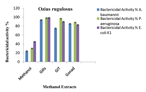 | Figure 5: Bactericidal activity. P. aeruginosa, A. baumannii and E. coli k1 were inhibited by Ozius rugulosus (Metnanol gills extracts). Gills tissues had the overall best activity for all three selected bacteria and selected gut tissues (Perna viridis and Nerita albicilla). Methanol solvent (negative control) showed very low activity against all 3 selected bacteria. |