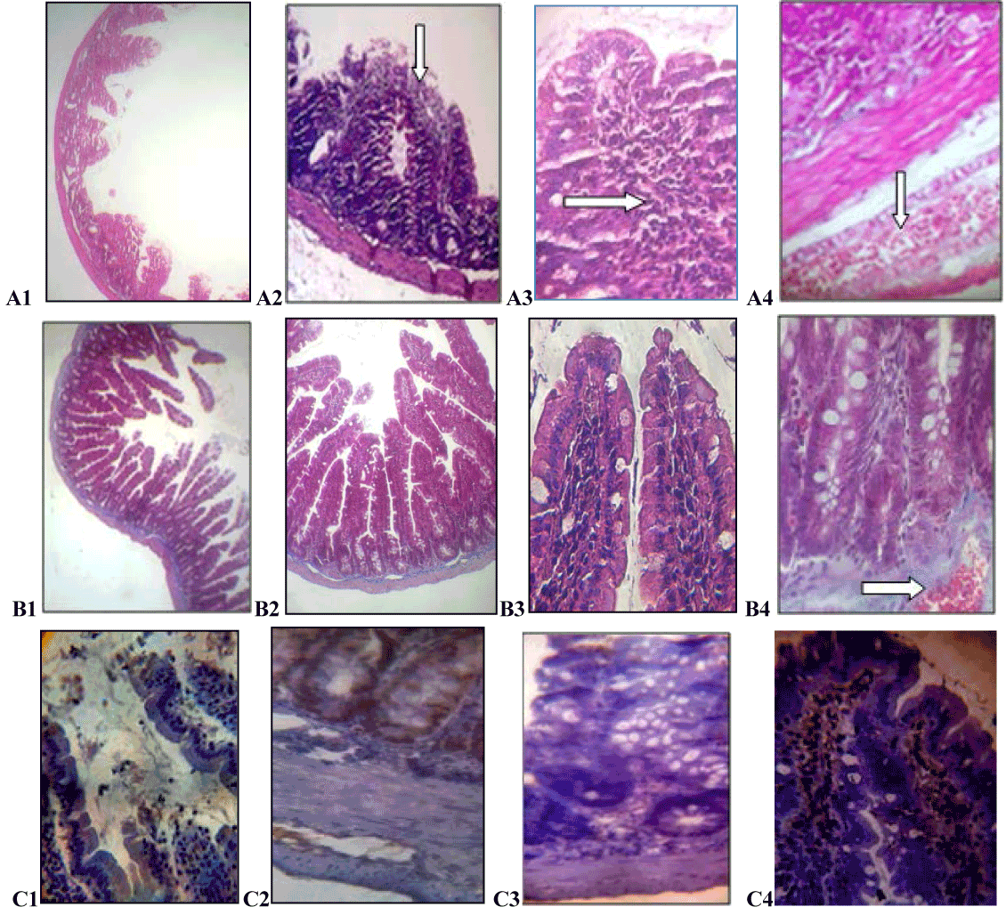 | Figure 3: 5-FU/distilled water treated group: On day 8, 5-FU caused mucosal damage in the jejunum. It cause blunting of villi, they appear short and broad and sometimes missing (A1, H&E ×40), some of the absorbing cells are lost in some area, arrow (A2, H&E×100), and the goblet cells are markedly decreased in number with infiltration of inflammatory cells in the lamina propria, arrow (A3, H&E ×400), muscular edema and congested blood vessels also can be seen, arrow (A4, Trichrome ×400). On day 12, the villi of jejunum restore it shape (B1,Trichrome ×40; B2,Trichrome ×100), they are nearly intact and completely covered by tall columnar cells (B3, H&E ×400). Nearly intact crypts with normal epithelial lining are also observed, but congested blood vessels also can be seen, arrow (B4, Trichrome ×400). Negative and moderate Ki-67 immuno reactivity in nuclei of cells at day eight and twelve respectively (C1, immunohistochemistry ×100, C2, immunohistochemistry ×400). Negative and moderate cytoplasmic reaction to Bcl-2 cells at day eight and twelve respectively (C3 immunohistochemistry ×400, C4, immunohistochemistry ×400). |