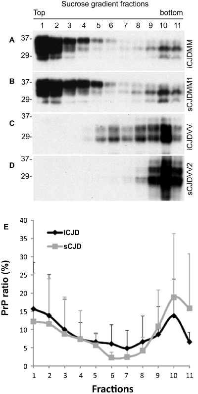 | Figure 2: Analysis of PrP oligomeric state by sucrose step gradient sedimentation. (A through D) Western blot analysis of PrP in different fractions of sucrose step gradient sedimentation. After ultracentrifugation of PrP in sucrose step gradients, 11 fractions were collected from the top of the gradients. PrP in individual fractions was detected by Western blotting with 3F4, which was subjected to densitometric analysis. (A) iCJDMM1; (B) sCJDMM1; (C) iCJDVV2; (D) sCJDVV2. PrP recovered in the top fractions 1-3 mainly represents monomers or small oligomers while PrP recovered in the bottom fractions 9-11 represents larger aggregates. (E) Ratio of PrPSc in each fraction to total PrP in all 11 fractions quantitated by densitometric analysis. No significant differences in PrP distribution profile were detected between iCJD (n=5) and sCJD (n=5). |