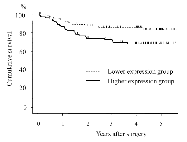 | Figure 3: The overall survival of the patients according to the expression of IDO in NSCLC tissue specimens. A significant difference was observed in the survival rates between the patients with higher IDO expression than those with lower expression. |