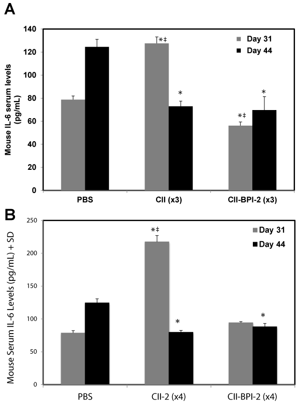 | Figure 5: The serum cytokine levels of IL-6 of mice treated with PBS, CII-2, and CII-BPI-2 on days 31 and 44. A, Mice treated with three injections of CII-BPI-2 have significantly lower levels of IL-6 in the serum than those injected with PBS (*, p <0.0001) and three injections of CII-2 (#, p <0.0001). Serum IL-6 levels are significantly higher on day 31 in the mice treated with CII-2 than in PBS-treated mice (‡, p <0.0001). Serum levels of the cytokine IL-6 are significantly lower on day 44 after three injections of CII-2 (*, p <0.0001) and CII-BPI-2 (*, p <0.0001) compared to PBS. A significant difference between IL-6 levels of CII-2 and CII-BPI-2 on day 44 was not observed. B, Comparison of serum IL-6 levels of mice treated with four injections of PBS, CII-2, and CII-BPI-2 on days 31 and 44. Serum IL-6 levels are significantly higher in the CII-2 group compared to the PBS group (‡, p <0.0001) and CIIBPI- 2 (*, p <0.0001). Significant differences between IL-6 levels of CII-BPI-2 and PBS were not observed. On day 44, serum IL-6 levels were significantly higher in the PBS-treated group compared to the CII-2 (*, p <0.0001) and CII-BPI-2 groups (*, p <0.0001). No significant difference in IL-6 levels was observed between CII-2 and CII-BPI-2 treated groups on day 44. |