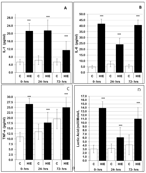 | Figure 2: Changes in Inflammatory cytokines (IL-1; IL-6; TNF-a; pg/ml) and Lactic acid (mmol/L) in healthy control newborns (C) and hypoxic patients (HIE) along 0, 24 and 72 hours post labouring. Values within same parameter and at same time-interval not sharing common superscripts denote significant differences (*** p<0.001). |