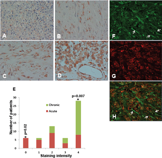 | Figure 1: Heparanase elevation in pleural empyema. A-D: Immunostaining. Specimens from 46 empyema patients were subjected to immunostaining applying anti-heparanase antibody. Shown are representative photomicrographs of biopsies exhibiting very weak (+1; A), weak (+2; B), moderate (+3; C) and strong (+4; D) staining of heparanase. Very weak staining (+1) was most often observed in acute empyema while chronic empyema is associated with higher levels of heparanase (B-D). This association is shown graphically in (E). Original magnification: A-D x40. F-H: Immunofluorescent staining. Specimens of chronic empyema were subjected to immunofluorescent staining applying anti heparanase (F) and anti CD163 (human macrophage marker; G) antibodies. Merged image is shown in (H). (arrows). Shown are representative photomicrographs; Original magnification: x40. Note that heparanase staining is cytoplasmic whereas CD163 labels a membrane determinant, and that heparanase also labels CD163-negative cells that are suspected (by morphology) to be endothelial cells lining lumen-containing structures (arrows). |