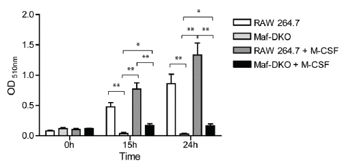 | Figure 1: Proliferation rates of RAW 264.7 and Maf-DKO cells in the presence and absence of M-CSF. The SRB assay for total cell protein mass was used to follow proliferation of RAW 264.7 and Maf-DKO cells in the presence and absence of L929-cell CM (MCSF). The increase in cell mass is plotted as the change in optical density at 510nm. Data represent means ± SEM of three independent experiments performed in triplicate. (*p<0.05, **p<0.01; unpaired t-test) |