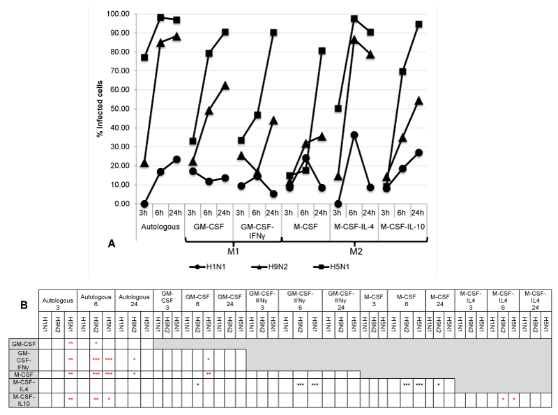 | Figure 1: Susceptibility of human M1 and M2 macrophages to Influenza viruses. (A) CD14+-cells were purified from human PBMCs cultured in presence of 5% autologous serum, recombinant GM-CSF, GM-CSF+IFNγ, M-CSF, M-CSF+IL4 or M-CSF+IL10. Cells were incubated with Influenza A/California/04/2009 virus (H1N1), A/Quail/Hong Kong/G1/97 (H9N2) or A/Hong Kong/483/97 (H5N1) at Multiplicity of Infection (MOI) of 2. At 3, 6 and 24h p.i. cells were fixed with 4% paraformaldehyde, permeabilized and stained for influenza A nucleoprotein and DAPI. The chart showed the median of three different experiments from 3 independent donors. (B) Table shows statistical significance of % of influenza infection of the different macrophages at each time point *p<0.05, **p<0.01, ***p<0.001. Red shows that the reference cell line (listed at the top of column) is significantly higher than the comparator (cells listed on the left) and black shows that it is differently lower, using two-way ANOVA followed by a Bonferroni multiple-comparison test. |