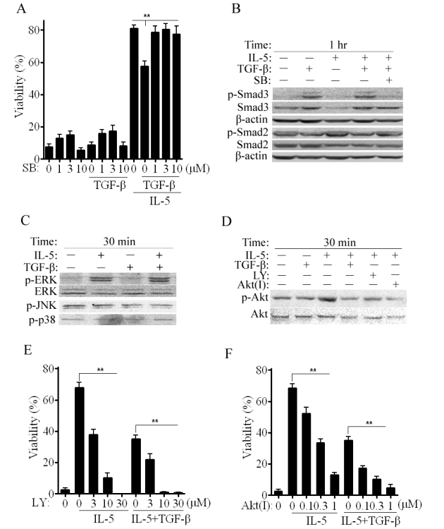 | Figure 4: TGF-ß1 inhibits Akt phosphorylation induced by IL-5 signaling. (A) 72 hr viability of PBEos left untreated (0), treated as shown with or without SB431542 (SB). (B, C and D) Immunoblots of PBEos treated with SB, LY294002 (LY) or Akt Inhibitor IV (AktI). (E) and (F) Viability of PBEos treated as shown and presented as a percentage of viability at time 0. **, p< 0.03 (one-way ANOVA). All blots are representative of at least 3 independent experiments with different donors and data are expressed as the mean ± SEM. |