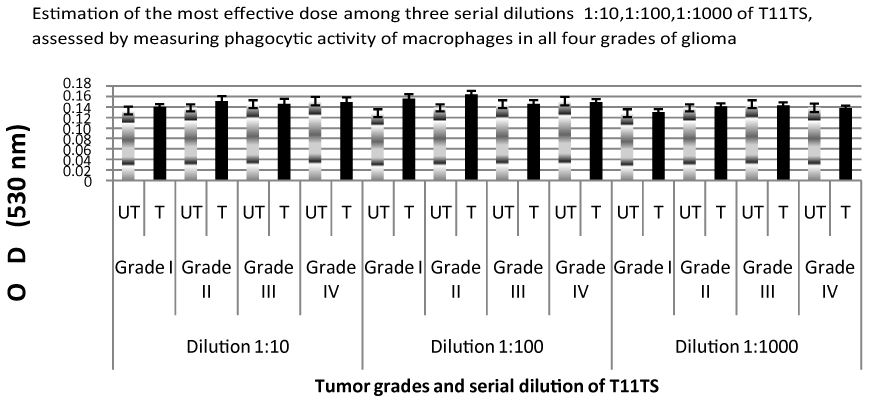 | Figure 2: Estimation of the most effective dose among three serial dilutions 1:10, 1:100, 1:1000 of T11TS, assessed by measuring phagocytic activity of macrophages in all four grades of glioma.This comparison was made by measuring phagocytic potential between treated macrophages with serial dilution of T11TS and untreated macrophages in all four grades of glioma. |
