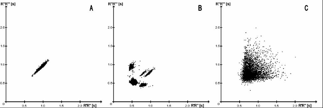 | Figure 1: Examples of Poincaré plots based on one hour ECG recordings. The R-R interval fluctuation is one calculated parameter used to rate the AF risk. The plot in the healthy subject (A) shows a baseball bat like structure. The calculated risk level is 0. The disseminated clusters in a patient with a history of PAF (B) indicate increased R-R interval dynamics (risk level 1). In patients with chronic AF (C) widely scattered R-R intervals indicate a maximum of variability. The calculated level is 2. |