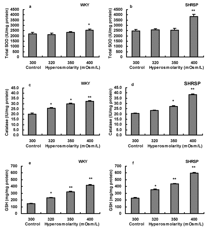 | Figure 6: Myocardial antioxidants at the end of ischemia/reperfusion with and without hyperosmotic perfusion. Hyperosmotic NaCl increased myocardial antioxidants dose-dependently in normotensive Wistar-Kyoto rats (WKY) and stroke-prone spontaneously hypertensive rats (SHRSP). SOD, superoxide dismutase; GSH, glutathione. n=7-10. *P<0.05, **P<0.01 versus respective controls. |