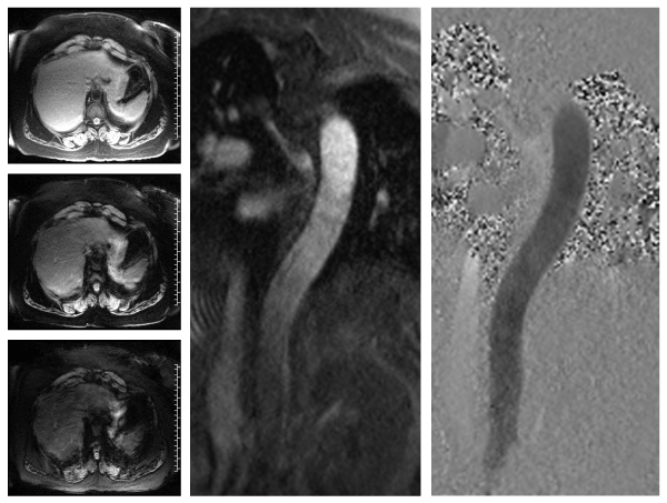 | Figure 1: Left panels: Images obtained at serial echo times (top: 1.9 ms, middle: 5 ms, bottom: 8.1 ms) from a tranverse plane abdominal multiecho gradient echo acquisition show the images used for liver T2* computation, a wellvalidated noninvasive technique to estimate liver iron content. In the absence of secondary causes of hepatic iron overload, liver iron content may be considered a suitable surrogate for total body iron. Middle panel: magnitude image showing a longitudinal section of the descending aorta. Right panel: velocity-encoded image showing in-plane velocities in the descending aorta, from which pulse wave velocity is calculated. |