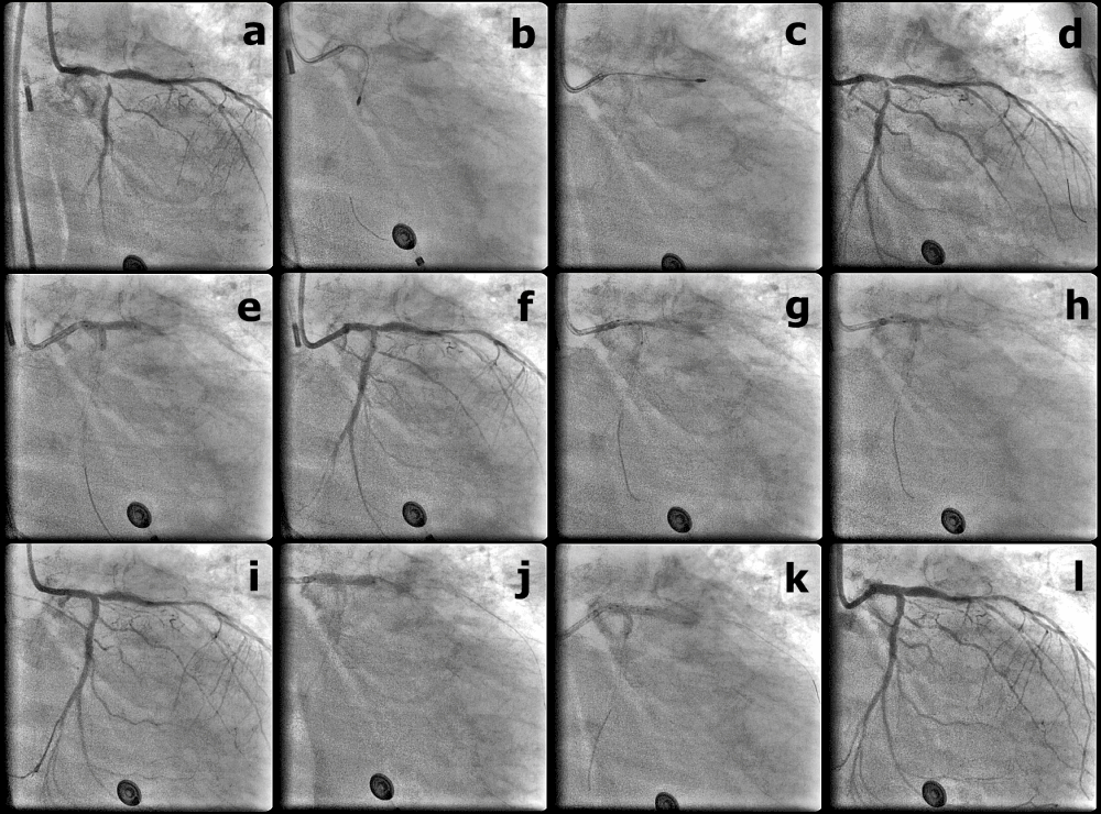 | Figure 4: (a) Initial angiography, RAO 24°, caudal 30° with IABP support; (b) Rota-ablation with 1.5mm burr from LMCA to LCX; (c) Rota-ablation with 1.5mm burr from LMCA to LAD; (d) after Rota-ablation; (e) Pre-dilatation with 2-balloon kissing inflation, a 3.0/15 mm balloon from LMCA to LCX and a 3.0/20 mm balloon from LMCA to LAD; (f) After pre-dilatation with2- balloon kissing inflation; (g) 1.5/20 mm balloon was inflated first to 14 atm; (h) Balloon-stent kissing dilatation, with a 1.5/20 mm balloon from LMCA to LAD and TaxusLiberte 3.0/16 mm stent from LMCA to LCX; (i) After balloonstent kissing dilatation; (j) TaxusLiberte 3.5/20 mm stent from LMCA to LAD after rewiring the stent strut and adequate balloon dilatation; (k) Final kissing balloon dilatation with 3.5/15 mm and 3.0/15 mm NC balloons to 8 atm; (l) Final angiography, RAO 24°, caudal 30°. |